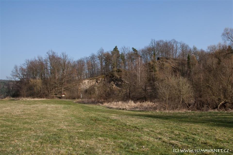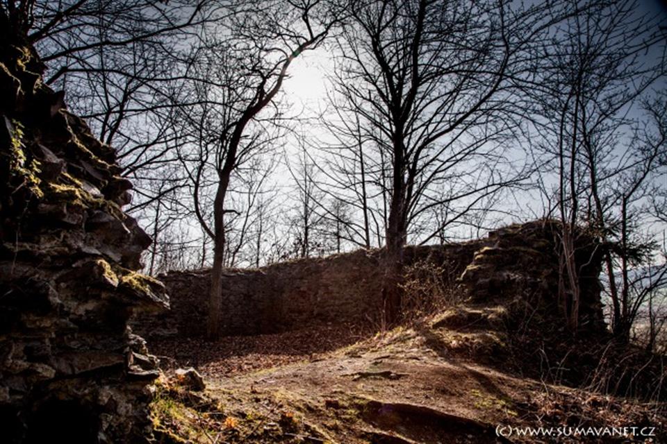 Zřícenina hrádku (tvrze) na strmém vrchu nad řekou Úhlava, 1,5 km od Švihova.