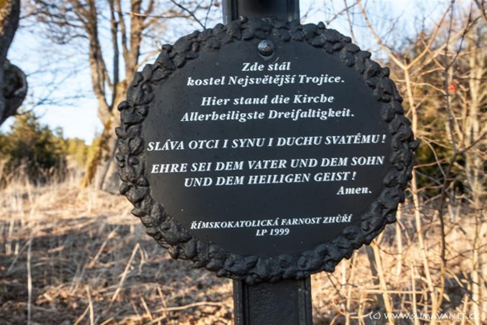 Z iniciativy bývalých zhůřských občanů a za přispění Města Hartmanice byla v místě zbořeného kostela postavena malá kaplička nejsvětější Trojice. Kříž smíření dokládá smutný osud zaniklé obce. Jsou zde také vidět dvě umrlčí prkna zdobená německými nápisy.