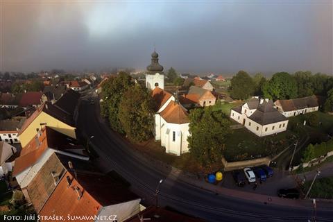 Původní kostel stál již v roce 1384, byl postupně přestavován a zvětšován. Už roku 1602 nemá původní gotickou věž, ale jen zvonici s helmovou střechou. V roce 1744 zcela vyhořel, zůstaly jen pevné zdi, které pro svou sílu byly použity k nové, zaklenuté stavbě. V roce 1746 byl kostel dostavěn a vysvěcen, na den svátku sv. Václava.