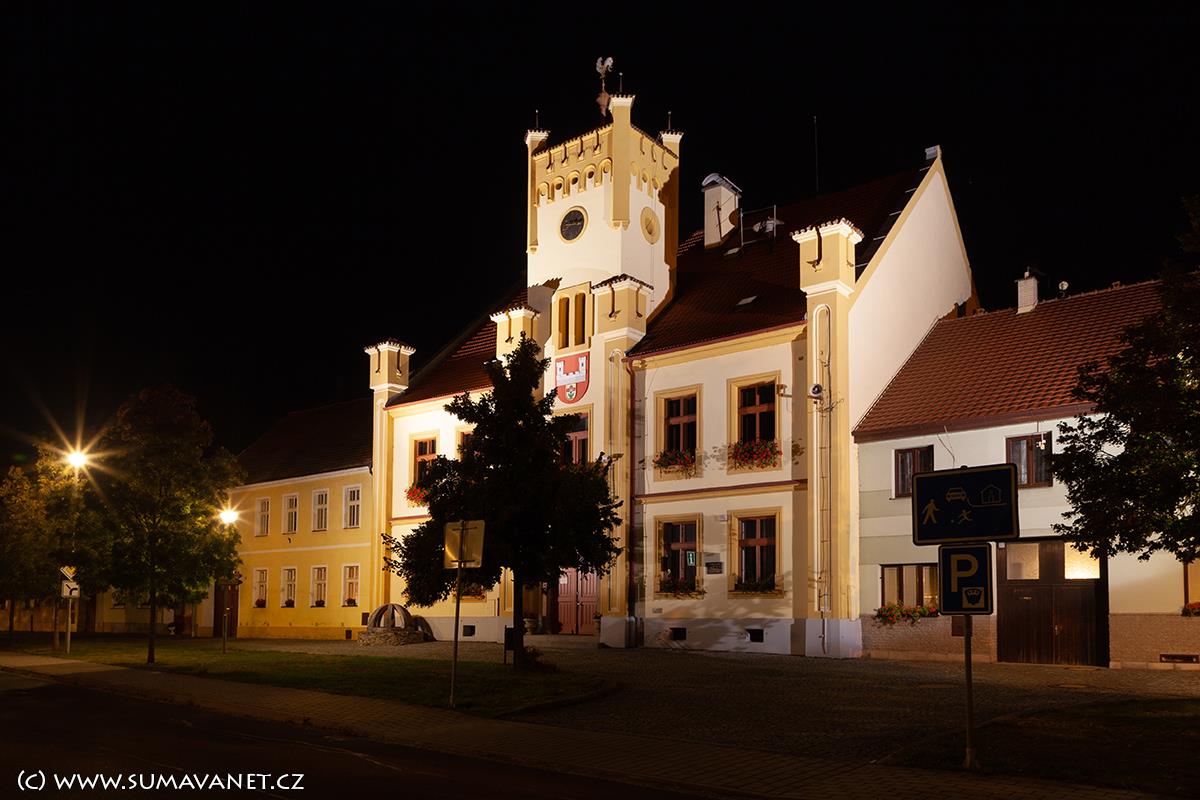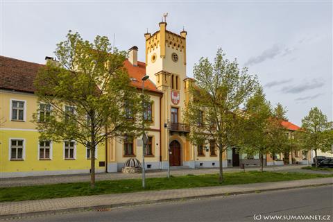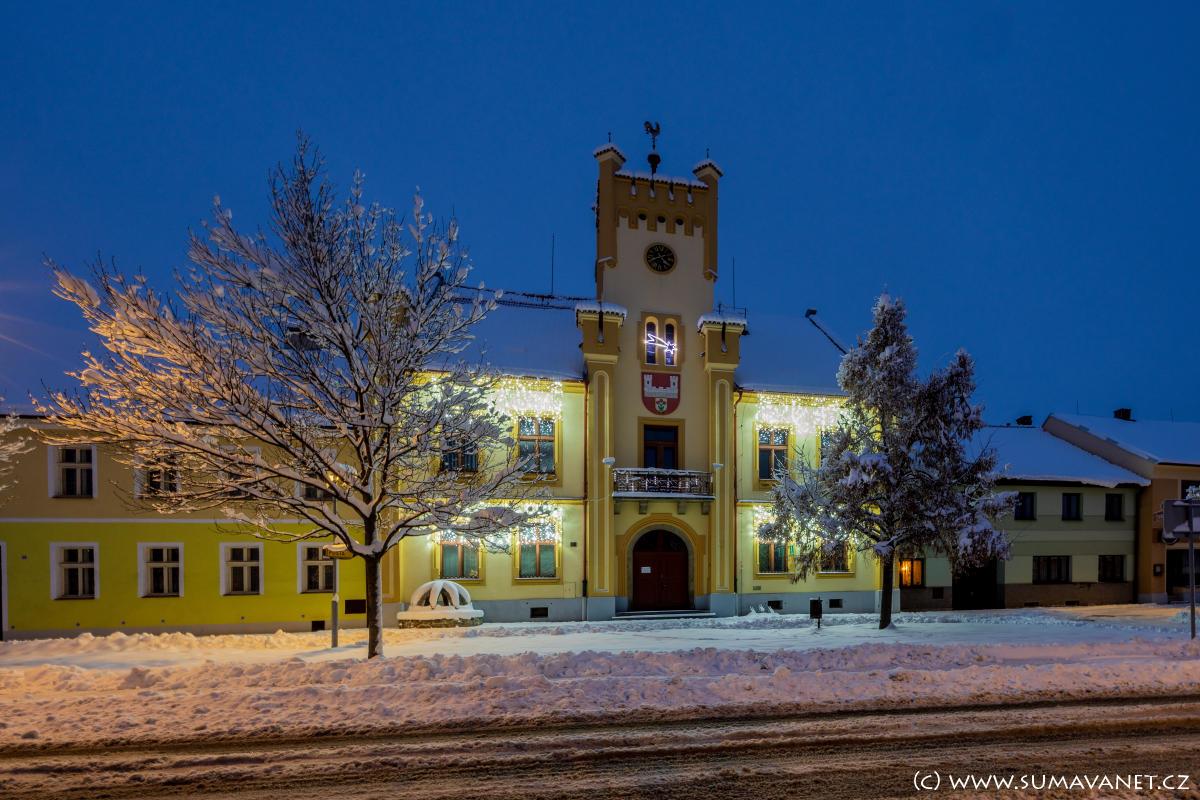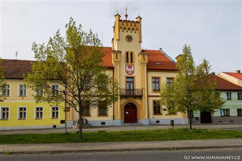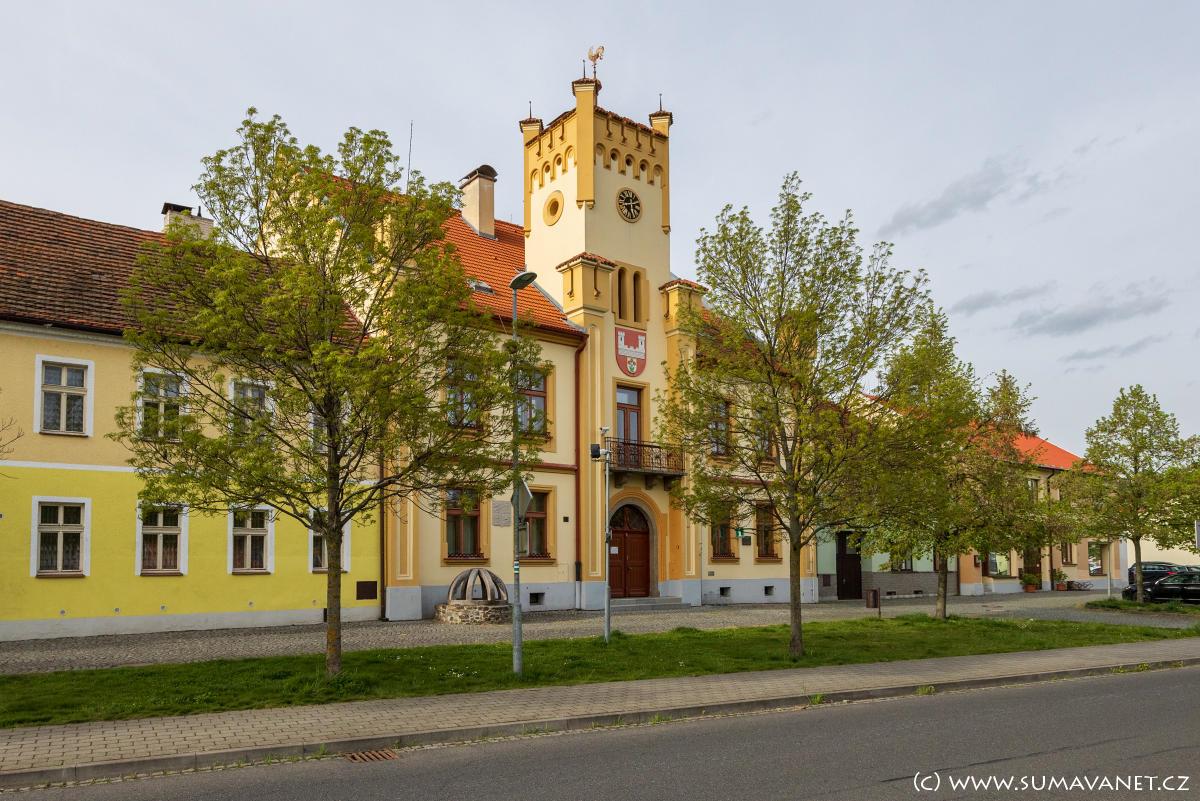 Původní radnice byla přízemní budova s věžičkou a většinou dřevěných konstrukcí. Byla pozoruhodná zvonkem zvaným „hlásníček“, který o jarmarcích zvěstoval „frejunk“, tj. čas, kdy směli začít kupovat zboží přespolní. Domácí měli přednost nákupu a to do 9 hodin. Zchátralá budova však dělala obci ostudu a tak padlo v roce 1800 usnesení na stavbu nové radnice. Tato budova s četnými úpravami a přístavbami stojí dodnes. Nejvíce ji poznamenala úprava z roku 1911, kdy dostala novou věž s cimbuřím a fasádu, zjevně inspirovaná nedalekým hradem. Je to jedna z nejhezčích radnic v kraji a plně reprezentuje naše historické město.