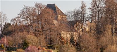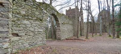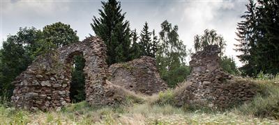 Romantická zřícenina kostela z roku 1370 na vrchu nad obcemi Běšiny a Tržek
